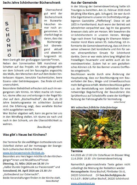 zwei Seiten voller Neuigkeiten und Informationen aus der Gemeinde. Sie lag in Ihrem Briefkasten, aber Sie können sie genau so gut hier online lesen, und das sogar in einer farbigen Version. Zum Vergrößern einfach Klick auf die gewünschte, unten abgebildete Seite. Schauen Sie doch mal rein!